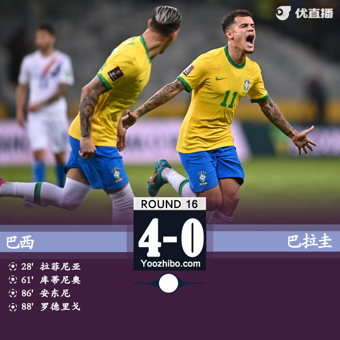 24直播网2月2日讯 北京时间2月2日8:30,卡塔尔世界杯南美预选赛第16轮巴西主场迎战巴拉圭的比赛。上半场拉菲尼亚闪击被吹后低射破门,半场战罢,巴西1-0巴拉圭。下半场拉菲尼亚中柱,库蒂尼奥远射世界波破门,安东尼、罗德里戈替补再进两球,最终巴西4-0大胜巴拉圭保持不败。