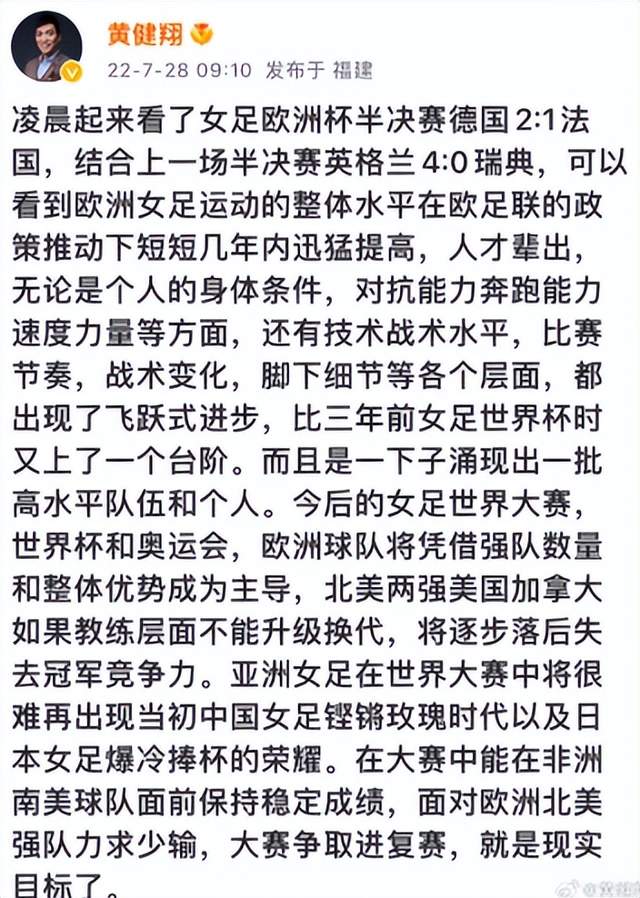 事实上,黄健翔在1年前就已经言中今日的结果。当时的女足欧洲杯,让黄健翔看到了差距。对于中国女足来说,我们必须已经清楚地意识到,与欧洲强队的差距越来越大。这是不可避免的,因为欧洲有着浓厚的足球文化,只要他们发力女足,提升会很迅速,这得益于他们上百年塑造的足球文化。而中国女足最好的学习对象就是日本,他们是怎么用10多年的时间走到亚洲顶级世界一流,从基层到塔尖,都值得学习甚至模仿。