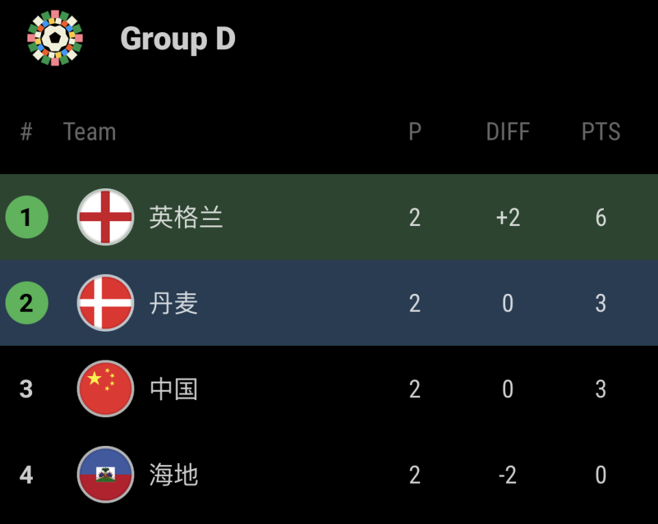 目前D组战罢2轮,英格兰2战2胜6分领跑。而丹麦和中国女足都是1胜1负积3分并列次席。海地队2战2负积0分排名垫底。末轮比赛,英格兰将对阵中国女足,而海地队则会与丹麦队过招。