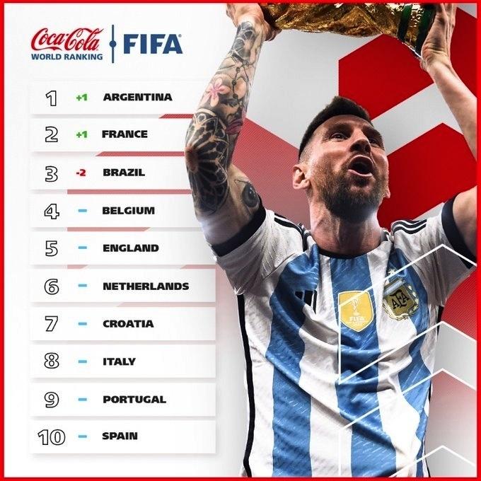 FIFA公布最新排名:阿根廷时隔6年重返第一!日本进前20,国足跌第81
