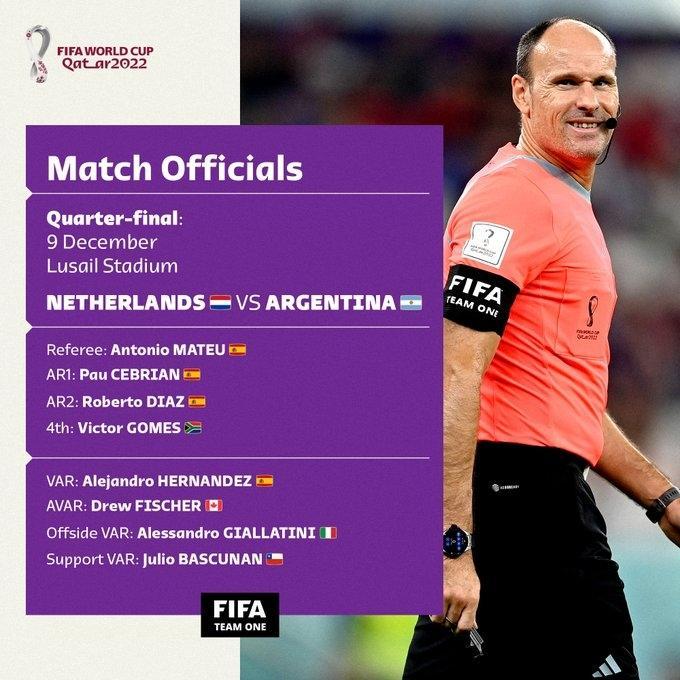 来源:24直播网12-08 18:3824直播网12月08日国际足联今日公布了巴西vs克罗地亚以及阿根廷vs荷兰两场1/4决赛的裁判团队信息,西班牙名哨拉霍斯执法荷兰vs阿根廷,英格兰名哨奥利弗执法巴西vs克罗地亚。