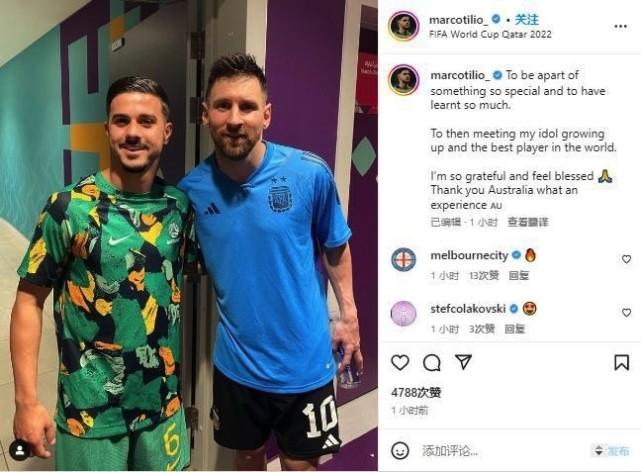 不仅是阿诺德,澳大利亚两位球员也通过晒出合影的方式,向梅西致敬并对其赞不绝口。澳大利亚21岁的前锋蒂利奥晒出与梅西赛后的合照,并附图写道:“和如此特别的一些事说再见,并学到了很多东西。见到了我成长中的偶像和世界最佳。我很感激也很幸福,谢谢澳大利亚,多么棒的一段经历。”