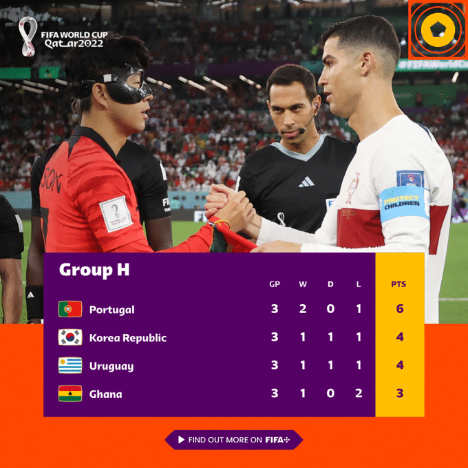 世界杯GH组最终积分榜形势:韩国力压乌拉圭晋级