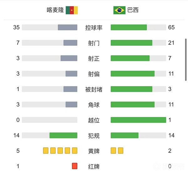 第90+2分钟,阿布巴卡尔在禁区内接到队友右路传中,头球攻门得手,随后脱衣庆祝两黄变一红被罚下,喀麦隆1-0巴西。