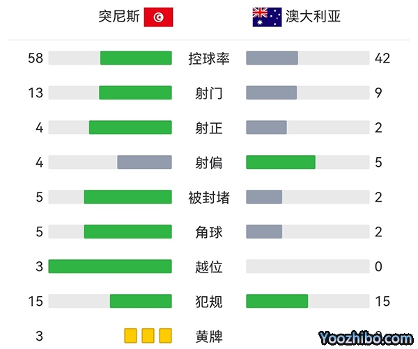 全场比赛结束,最终澳大利亚1-0击败突尼斯。