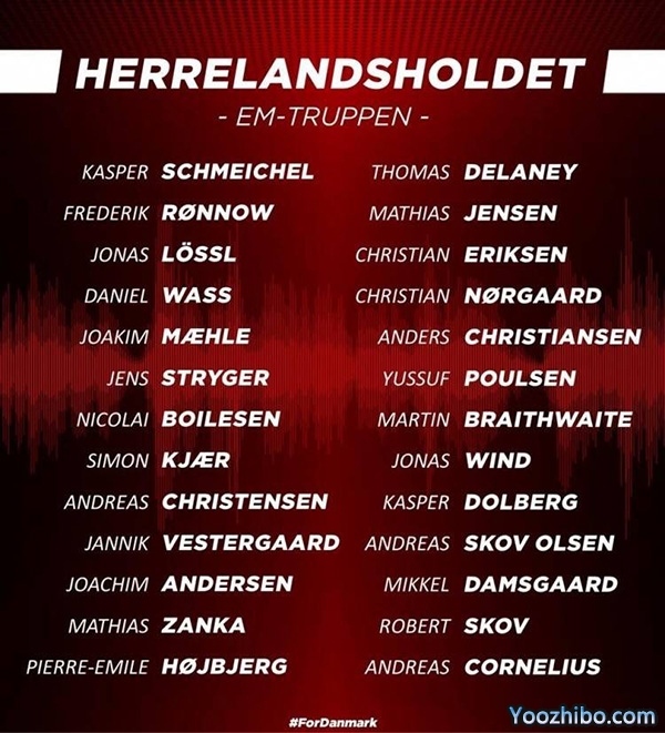 中场:埃里克森(国际米兰)、德莱尼(多特蒙德)、霍伊别尔(托特纳姆热刺)、延森(布伦特福德)、诺加德(布伦特福德)、克里斯蒂安森(马尔默)