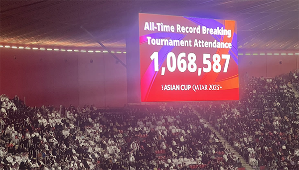 这是在亚洲杯淘汰赛1/8决赛,东道主卡塔尔队以2-1击败巴勒斯坦,晋级八强,这场比赛结束之后,亚洲杯总观战人数创新高,根据统计显示,本届亚洲杯至今,现场总观赛人数超过了100万,达到了106万8587人。这一数据已经打破了亚洲杯的赛会纪录。要知道本届赛事的重头戏还在后面,所以这一项纪录还会继续被刷新。