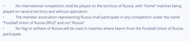 其次,俄罗斯的成员协会参加任何赛事,需以“俄罗斯足球联盟”的名义参赛,而不是以“俄罗斯”的名义。第三,.“俄罗斯足球联盟”球队参加的比赛,将不允许使用俄罗斯旗帜和国歌。