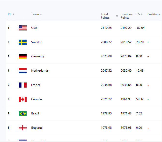 而女足方面,美国女足依然排名榜首,瑞典女足排名第二,随后是德国女足、荷兰女足、法国女足、加拿大女足、巴西女足、英格兰女足、朝鲜女足和西班牙女足。而第十一到第二十分别是澳大利亚女足、挪威女足、日本女足、意大利女足、丹麦女足、冰岛女足、中国女足、韩国女足、比利时女足和瑞士女足。而女足的积分比去年下降了60多分,不过依然排名世界前列,在亚洲也是排名靠前的球队。