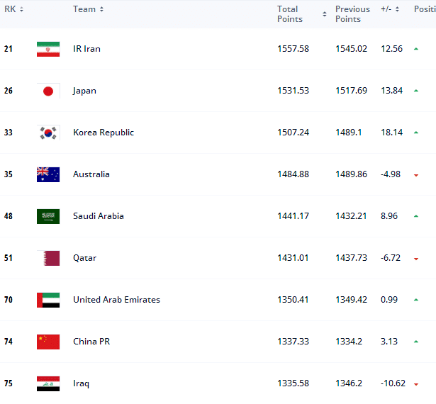 男足方面,第一的是比利时,随后是巴西、法国、英格兰、阿根廷、意大利、西班牙、葡萄牙、丹麦和荷兰。而德国队排名第11。亚洲球队方面,排名最高的是伊朗,他们世界排名第21,随后是日本的26名,韩国的33名,澳大利亚的35名,沙特的48名,卡塔尔的51名和阿联酋的70名,而国足的排名是世界第74名。需要说一下的是,2019年国足最终排名是76名,去年是75名,国足的排名已经连续两年上升了。