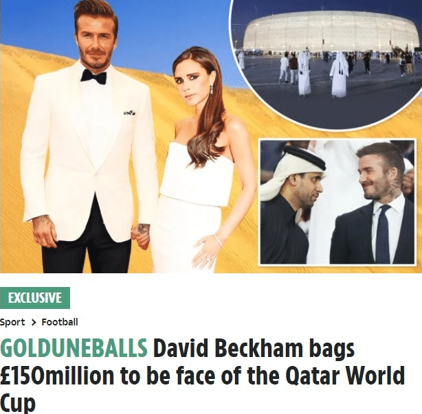 根据《太阳报》的消息显示,贝克汉姆已经去到了卡塔尔,考察和参观了世界杯的球场等等,双方签约在即。同时贝克汉姆的发言人也谈到了双方的合作,称:“大卫一直在谈论足球的力量,它在很多方面都可以成为一种向善的力量。”