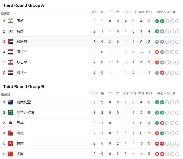 2战0进球丢4球,国足暂排12强赛B组倒数第一
