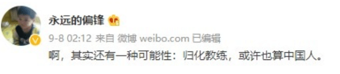 记者陈永随后评论道:“啊,其实还有一种可能性:归化教练,或许也算中国人。”