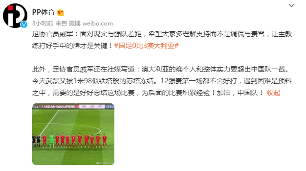 戚军表示,澳大利亚的确个人和整体实力要超出中国队一截。今天武磊又被1米98铁塔般的苏塔冻结。12强赛第一场都不好打,遇到困难是预料之中,需要的是好好总结这场比赛,为后面的比赛积累经验!加油,中国队!