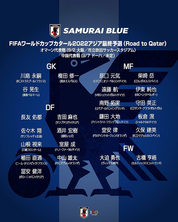 中场:原口元气(汉诺威)、柴崎岳(莱加内斯)、远藤航(斯图加特)、伊东纯也(亨克)、南野拓实(利物浦)、守田英正(圣克拉拉)、镰田大地(法兰克福)、板仓滉(沙尔克04)、堂安律(埃因霍温)、久保健英(马洛卡)