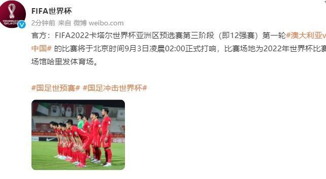 今日,FIFA官方官方消息,澳大利亚对阵中国男足世预赛,将于北京时间9月3日凌晨2点(卡塔尔当地时间9月2日21点)进行。