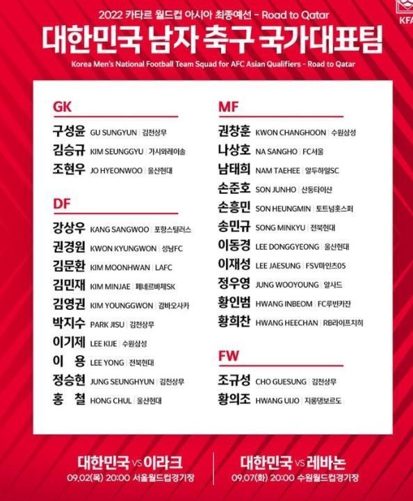24直播网讯 韩国国家队今日公布了9月份12强赛的大名单,由孙兴慜领衔。