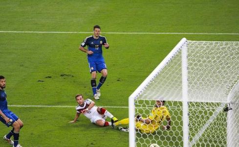 2014世界杯上半时阿根廷前锋伊瓜因曾打进一球,但由于越位在先而被吹罚无效,常规时间阿根廷队与德国队战成0-0平,比赛第113分钟,许尔勒左路过掉马斯切拉诺,随后一脚传中越过了德米凯利斯的头顶,格策胸部停球并用左脚完成凌空抽射,皮球直挂远角,德国队以1-0领先,在这样的时间段格策完成进球,无异于是绝杀了阿根廷,这也是世界杯历史上首次替补球员助攻另一位替补球员完成破门。