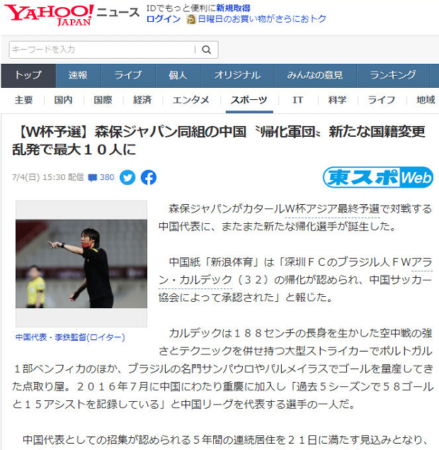 来源:24直播网07-05 11:2624直播网讯 今天日本媒体《雅虎体育》单独报道国足,在此前的世预赛12强赛抽签中,中国队和日本队分在B组,双方将会在之后的10场比赛中两度碰面,争夺晋级卡塔尔世界杯的晋级资格。日媒《雅虎体育》对于国足盛赞有加,他们重点关注到了32岁巴西前锋卡尔德克即将加入到中国队,这样中国队的归化球员数量达到了10名,接近完成“首发全归化”的阵容。