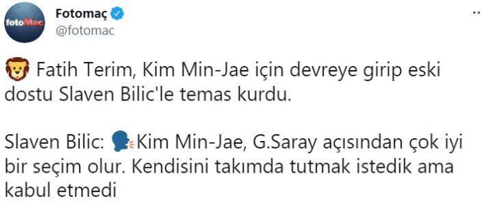 该媒体表示,比利奇在推荐金玟哉时对特里姆说:“金玟哉是中超联赛最好的中后卫之一,他会很适合加拉塔萨雷,我们想要留下他,可他自己执意要走。”