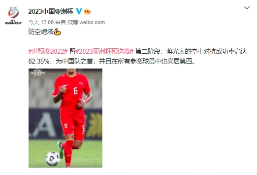亚足联在官方微博中写道:“防空炮塔!2022年世预赛暨2023亚洲杯预选赛第二阶段,蒋光太的空中对抗成功率高达82.35%,为中国队之首,并且在所有参赛球员中也高居第四。”