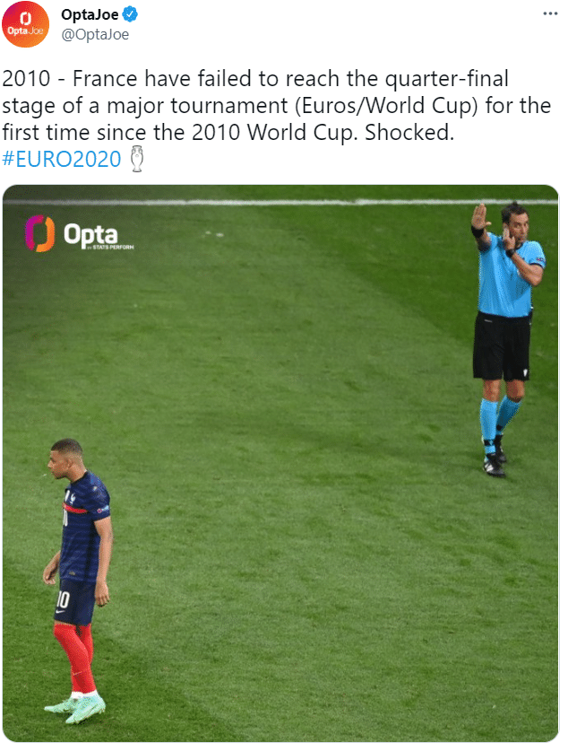 统计表明,这是法国自2010年世界杯以来,首次无缘国际大赛8强,他们在那一届赛事中小组赛遭到淘汰,2012年欧洲杯他们杀入8强被西班牙淘汰,2014年世界杯他们在8强被德国淘汰,2016年欧洲杯法国进入决赛被葡萄牙击败,2018年世界杯高卢雄鸡则击败克罗地亚夺冠。