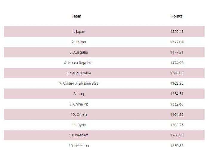 FIFA最新亚洲球队排名: 国足亚洲第九