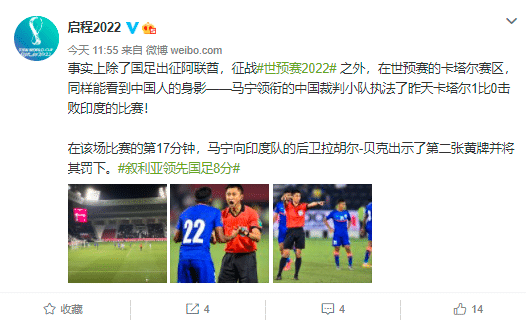 该博主表示:“事实上除了国足出征阿联酋,征战2022世预赛之外,在世预赛的卡塔尔赛区,同样能看到中国人的身影—马宁领衔的中国裁判小队执法了昨天卡塔尔1比0击败印度的比赛。在该场比赛的第17分钟,马宁向印度队的后卫拉胡尔-贝克出示了第二张黄牌并将其罚下。”