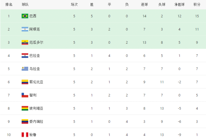 来源:24直播网06-05 11:3724直播网讯 6月5日,世预赛南美区结束了一场焦点战,巴西队以2-0击败厄瓜多尔,继续保持全胜。这样南美区的第5轮比赛已经全部结束,世预赛南美区的赛制是10支球队双循环,积分前四的直通卡塔尔世界杯,而第五名要和大洋洲的冠军争夺一张晋级世界杯的门票。现在看起来巴西队和阿根廷队这两支传统豪强还是保持着竞争力,而智利、乌拉圭等队则是选入到了大混战。接下来我们一起看看最新积分榜: