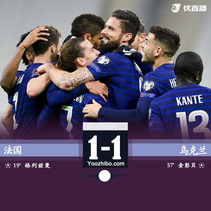 来源:24直播网03-25 12:11 24直播网讯:北京时间3月25日3:45,2022年世界杯欧洲区预选赛D组第1轮,法国主场对阵乌克兰。上半场,津琴科远射高出球门,吉鲁推射打高,格列兹曼远射破门。下半场,希多尔丘克的射门打在金彭贝身上折射破门,博格巴远射打偏,最终,法国1-1乌克兰。