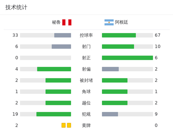 第32分钟,阿根廷反击,阿尔瓦雷斯推进后送出直塞,冈萨雷斯禁区左侧肋部倒三角传球,梅西跟进推射破门,阿根廷1-0秘鲁。