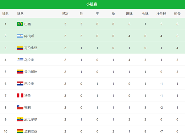 来源:24直播网09-13 16:1824直播网09月13日,世预赛南美区第二轮的5场比赛全部结束争夺,本轮没有梅西的阿根廷队以3-0横扫玻利维亚,委内瑞拉和厄瓜多尔取得首胜。巴西队第90分钟绝杀秘鲁,两连胜排名第一,接下来我们一起来看看世预赛南美区最新排名: