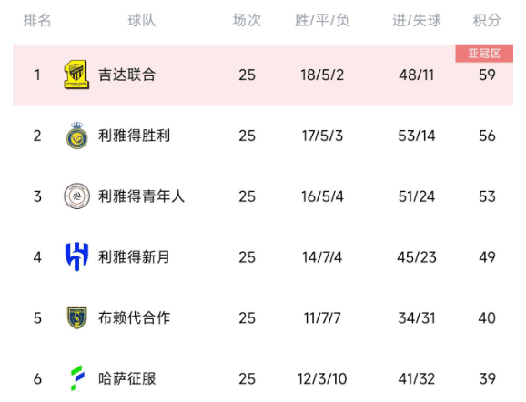 赛前吉达联合只要能够击败布赖代合作,就可以将优势拉大到6分,在还剩下5轮的情况下占据夺冠的绝对主动权。但如今吉达联合以1-2输球,这样他们的战绩来到18胜5平2负,积59分。利雅得胜利则是25轮56分,暂时落后吉达联合3分。
