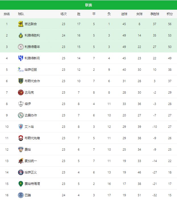 吉达联合依旧排名第一,他们在少赛一场的情况下领先第二名利雅得胜利3分,夺冠的希望很大。吉达联合属于后来居上,他们把握住了对手掉链子的机会,成功实现逆袭。目前吉达联合还有7场联赛要踢,他们积56分,依旧不能大意。