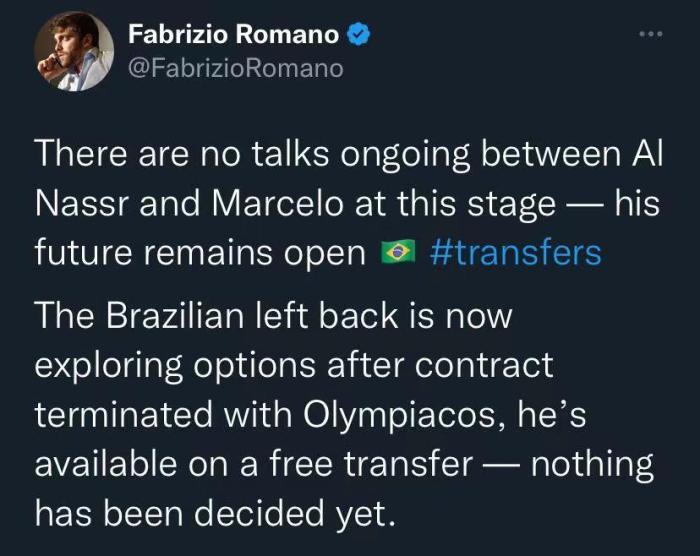 不过罗马诺表示,利雅得胜利目前没有与马塞洛谈判,球员的未来目前仍然开放。