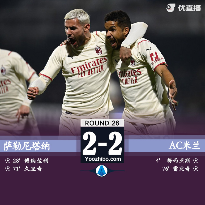 24直播网2月20日讯 北京时间凌晨3:45,2021-22赛季意甲联赛第26轮,AC米兰客场挑战萨勒尼塔纳。上半场,特奥送出直塞,梅西亚斯破门,博纳佐利利用一次反击机会为萨勒尼塔纳扳平比分;下半场久里奇帮助萨勒尼塔纳反超比分,不过很快雷比奇取得进球,最终AC米兰2-2萨勒尼塔纳。