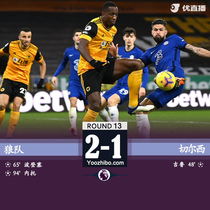 24直播网讯:北京时间12月16日02:00(英国当地时间15日18:00),2020/21赛季英超第13轮一场焦点战在莫利纽克斯球场展开争夺,切尔西客场1比2不敌狼队,吉鲁打破僵局,波登斯扳平,内托第95分钟绝杀。切尔西惨遭客场连败,狼队终结连败。