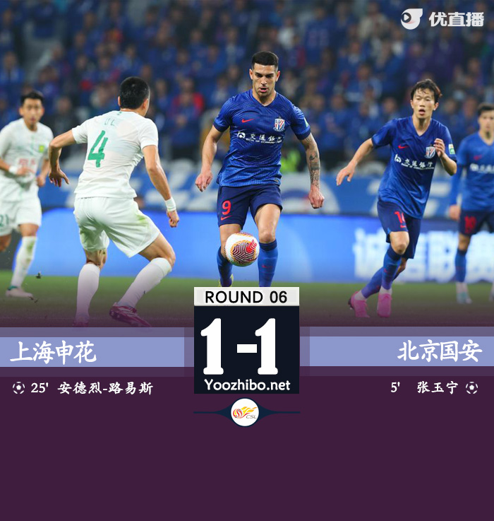 24直播网讯:北京时间4月13日19:35,中超第6轮焦点战,上海申花坐镇主场上海体育场迎战北京国安,本场主裁判为李海新,VAR裁判为金京元。上半场,张玉宁单骑闯关首开记录,随后林良铭错失良机,紧接着安德烈-路易斯兜射扳平比分。下半场,何宇鹏累计两黄被罚下。最终,申花主场1-1战平国安,中超开局五连胜遭终结。
