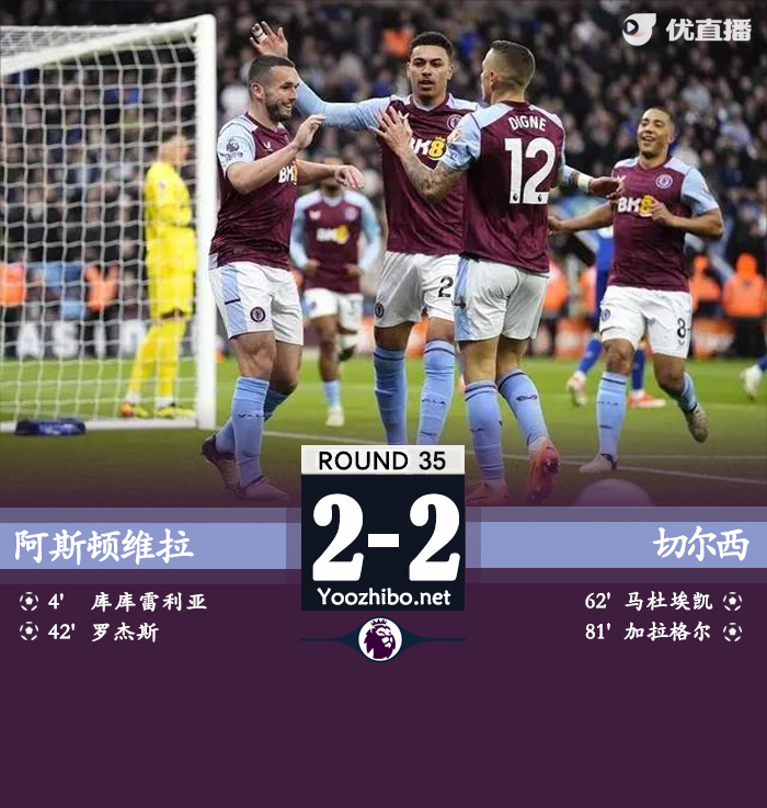 24直播网讯:北京时间4月28日凌晨3时,英超第35轮,切尔西客场挑战阿斯顿维拉。上半场,麦金打门造库库雷利亚乌龙,杰克逊破门被吹越位,之后还有一次头球攻门击中立柱,罗杰斯破门扩大比分优势。半场战罢,切尔西暂0-2阿斯顿维拉;下半场,马杜埃凯破门,加拉格尔世界波扳平比分,补时阶段,帕尔默单刀被扑,迪萨西头球破门被吹!全场比赛结束,切尔西2-2阿斯顿维拉!