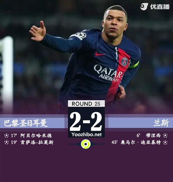 24直播网讯 3月10日北京时间20:00,法甲第25轮,巴黎主场迎战兰斯。本场比赛姆巴佩近5轮第3次替补。上半场,阿什拉夫送大礼,穆涅西轻松破门。贡萨洛-拉莫斯2分钟之内造乌龙+破门,迪亚基特半场尾声单刀扳平比分;下半场,姆巴佩第73分钟替补登场。最终,巴黎2-2战平兰斯,联赛遭遇三连平!积分榜仍10分领跑。