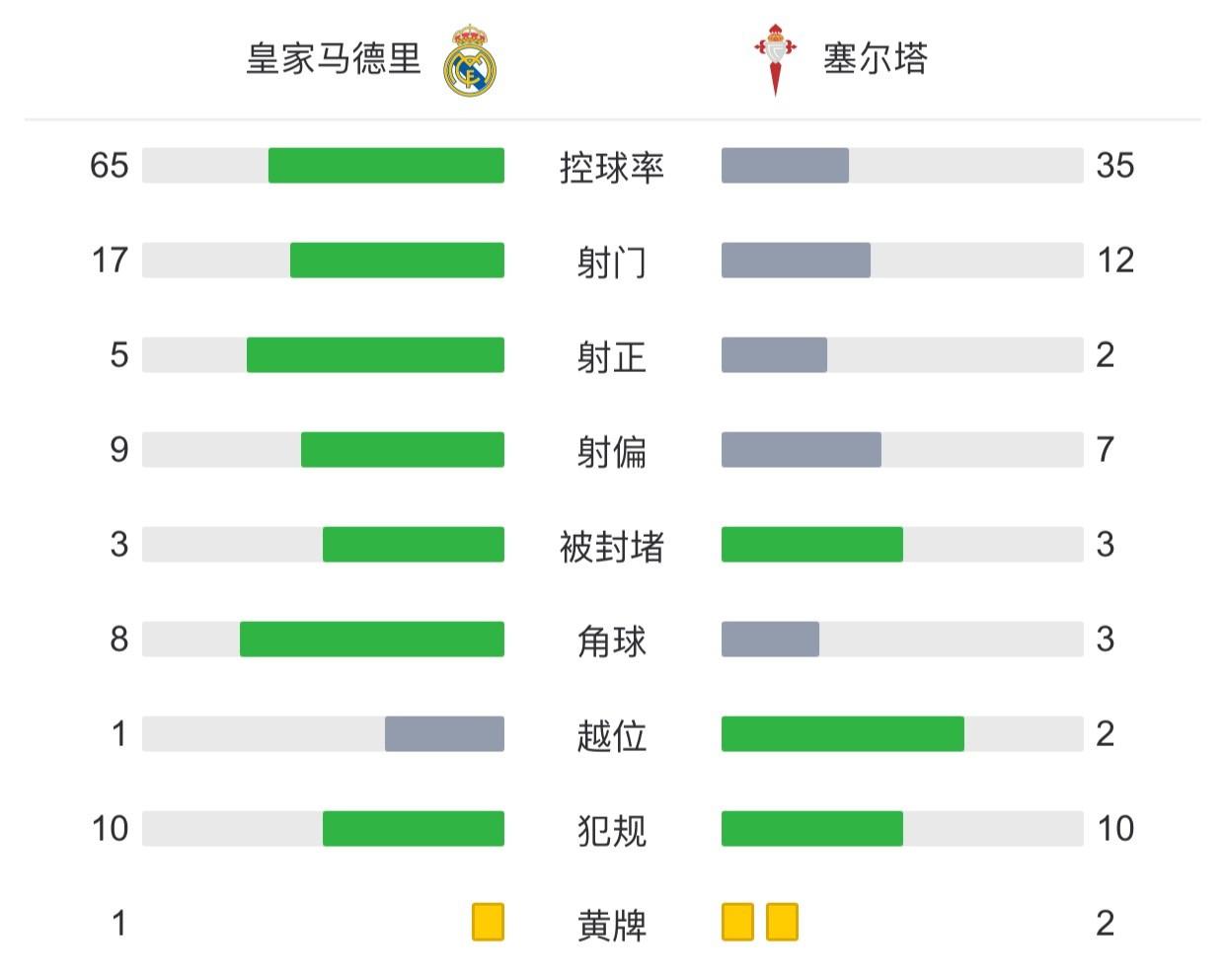 最终全场比赛结束,皇马2-0塞尔塔取得各项赛事的4连胜。