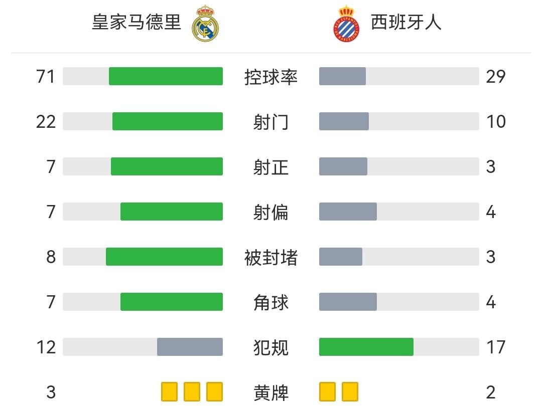 全场比赛结束,皇家马德里3-1西班牙人。