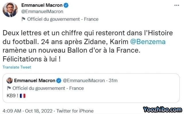 就连法国总统马克龙也第一时间发文,他先是发了一条写有“KB9”并配上法国国旗表情的动态,接着又在后续推文中补充道:“这是将被载入足球史册的两个字母和一个数字,在齐达内获得金球奖的24年后,卡里姆-本泽马为法国带来了另一座金球奖,祝贺他!”