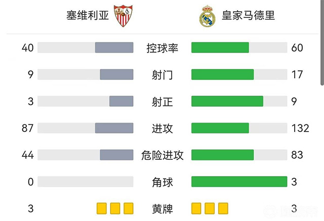 全场比赛结束,皇家马德里客场3-2逆转塞维利亚。
