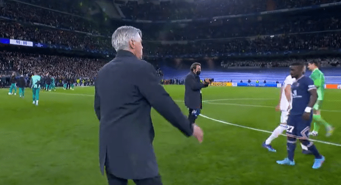 安切洛蒂也上前和对手致意,同时拥抱他的弟子们,他们完成了一场大逆转。