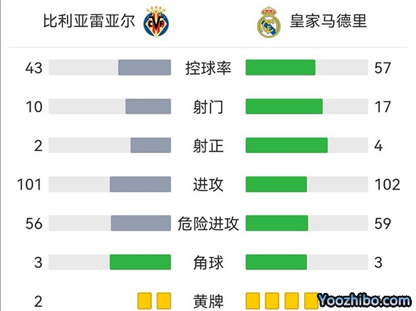 全场比赛结束,皇马客场0-0比利亚雷亚尔。