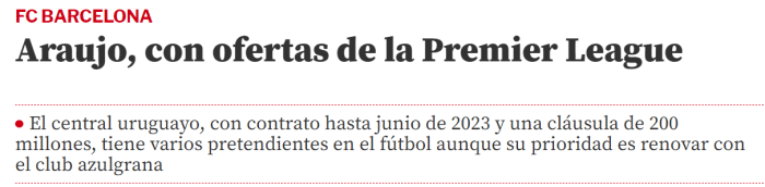 阿劳霍与巴萨的合同在2023年到期,《世体》称目前这位22岁的中卫已经收到很多报价,其中大部分来自英超。