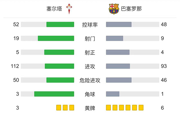 全场比赛结束,巴萨客场3-3塞尔塔。