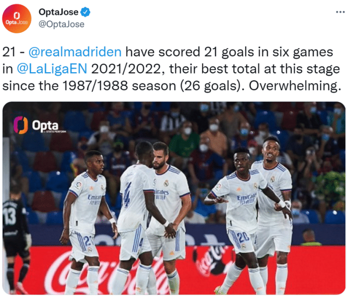 24直播网9月24日讯 根据OPTA数据统计,皇马前6轮联赛打进了21球,创造球队近34年来的最佳进球纪录。