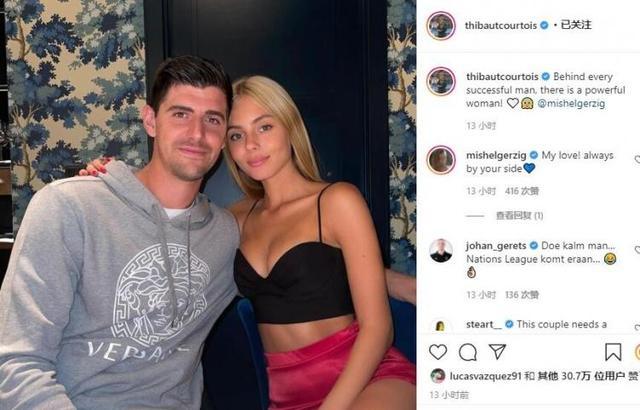 库尔图瓦在ins上写道:“每个成功男人的背后,都有一个强大的女人。”女友留言:“我的爱人,我永远在你身边。”